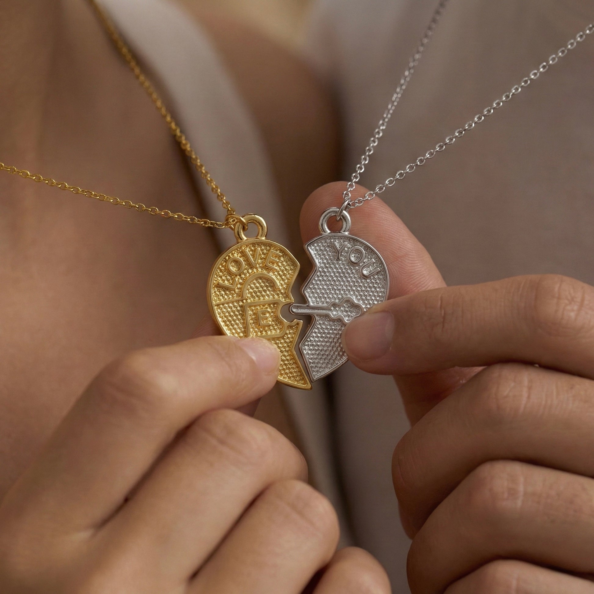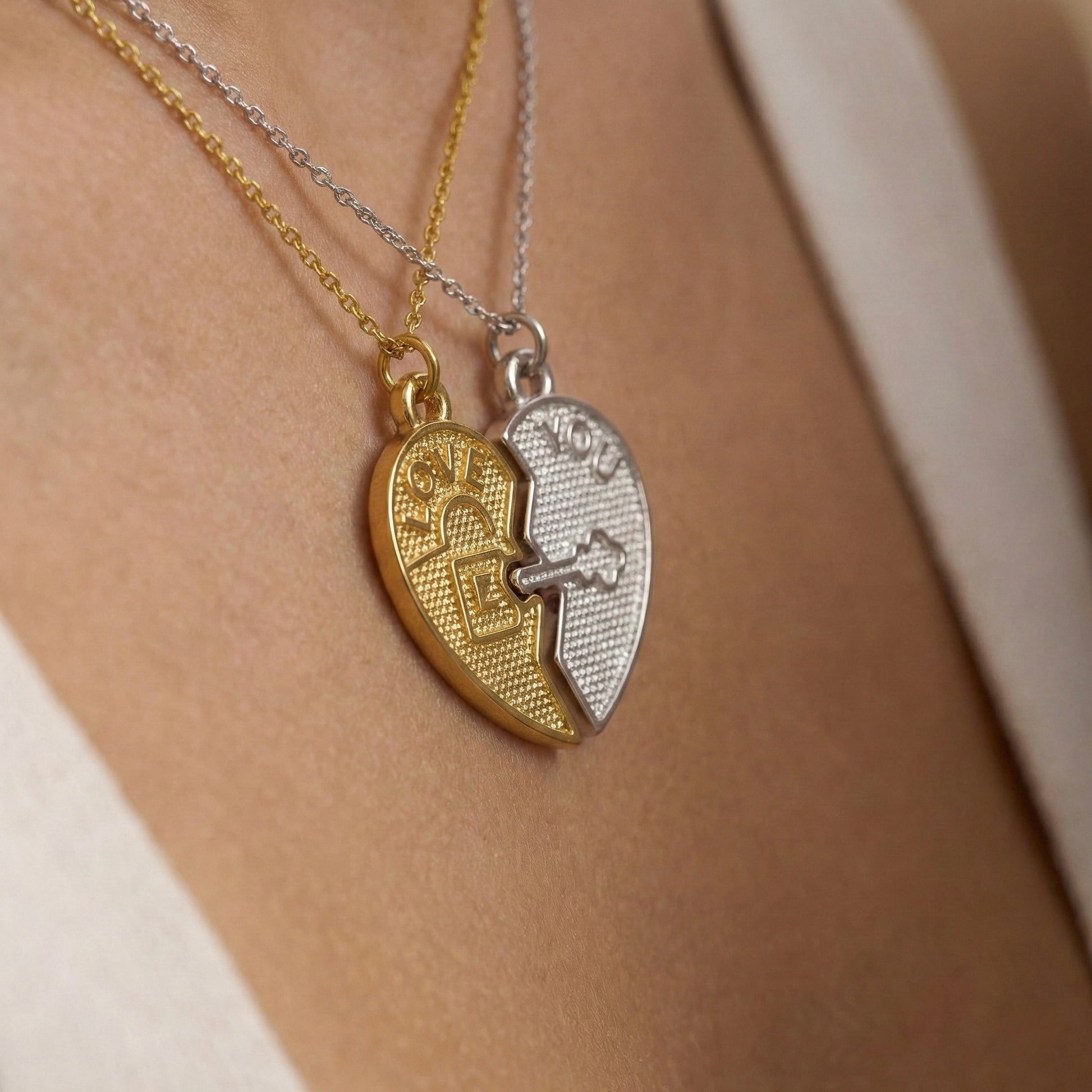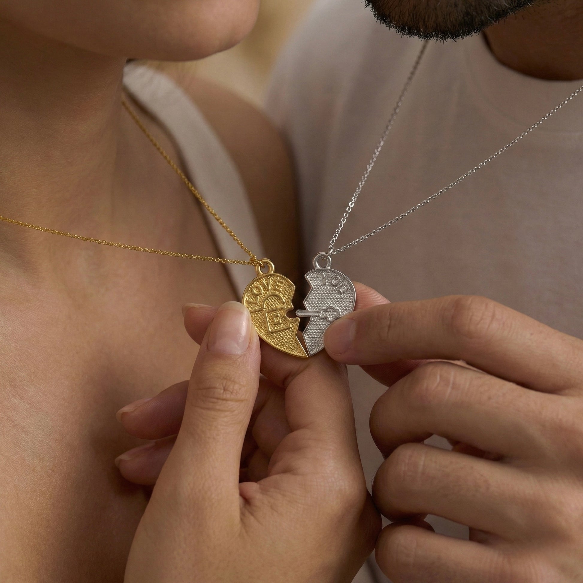 Birbirini tamamlayan iki ruhun hikayesini boynunuzda taşıyın. "Love" ve "You" yazılı iki yarım kalpten oluşan bu özel tasarım, iç içe geçen kilit ve anahtar mekanizmasıyla aşkın kusursuz uyumunu simgeler. Set içeriğinde kadın için zarafeti temsil eden Gold (Altın Kaplama) yarım kalp, erkek için ise modern ve maskülen bir duruş sergileyen Silver (Gümüş Kaplama) yarım kalp bir arada sunulur. Her bir Minon parçası usta zanaatkarların elinde şekillenir; bu nedenle el işçiliğinden kaynaklanan minik detay farklılıkları her seti size özel ve eşsiz kılar.