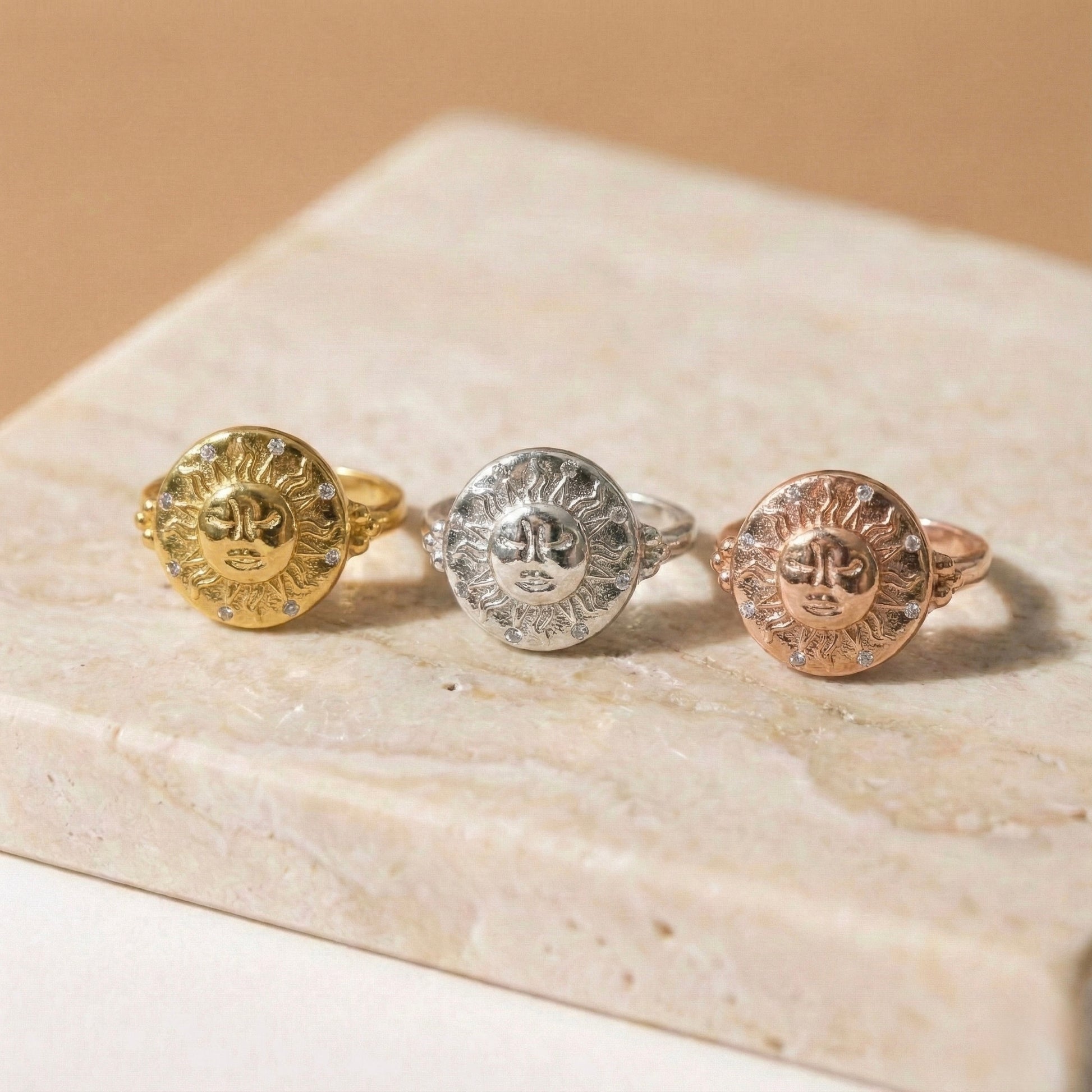 Güneşin kadim enerjisini ve mühür yüzük geleneğini bir araya getiren bu tasarım, stilinize güçlü bir imza katar. Merkezdeki güneş figürünün etrafına el işçiliğiyle yerleştirilen ışıltılı taşlar, tasarıma derinlik ve vintage bir lüks anlayışı kazandırır. Her bir Minon parçası usta zanaatkarların elinde şekillenir; bu nedenle el işçiliğinin doğasından kaynaklanan minik detay farklılıkları her tasarımı eşsiz ve size özel kılar.