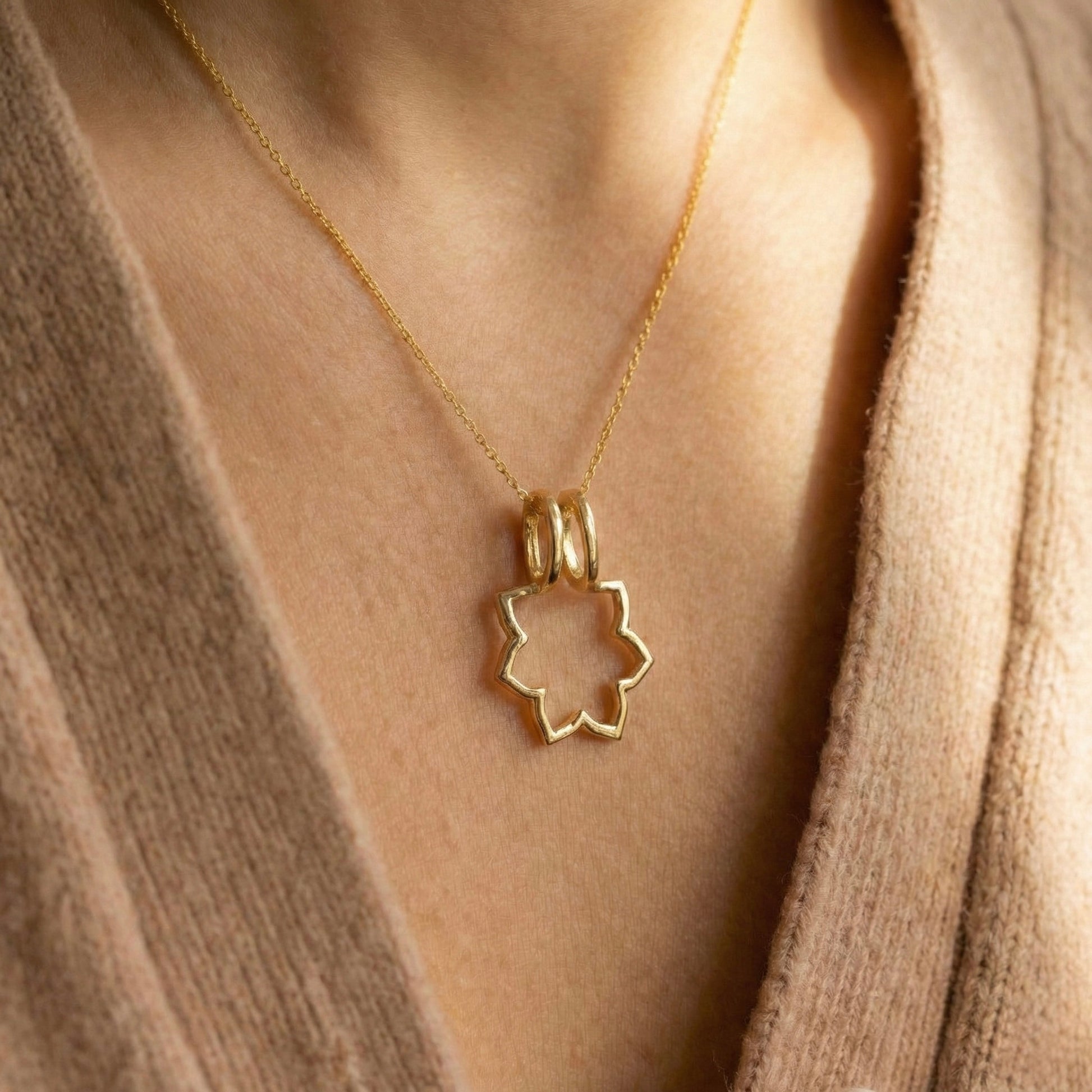 Yüzüğünüzü parmağınızda taşıyamadığınız anlarda (spor yaparken, çalışırken veya el hijyeni gerektiren durumlarda), onu kaybetme korkusu yaşamadan kalbinize en yakın yerde saklamanın en şık yoluyla tanışın. Geometrik lotus formuna sahip bu sihirli tasarım, kolyenizi boynunuzdan çıkarmaya gerek kalmadan yüzüğünüzü saniyeler içinde güvenli bir şekilde asmanıza olanak tanır. Hem tek başına minimal bir kolye ucu olarak estetik bir duruş sergiler hem de değerli yüzükleriniz için güvenli bir liman görevi görür.