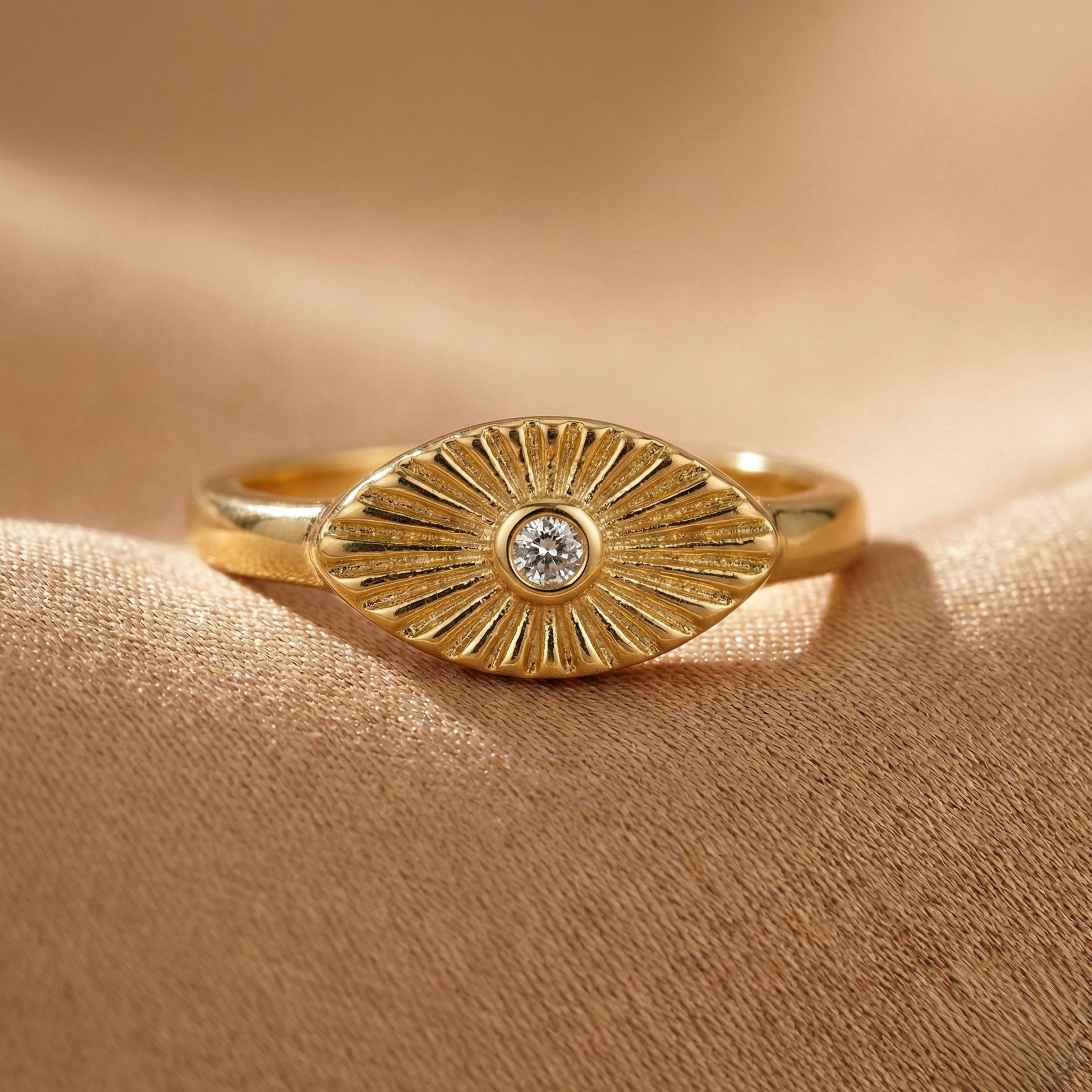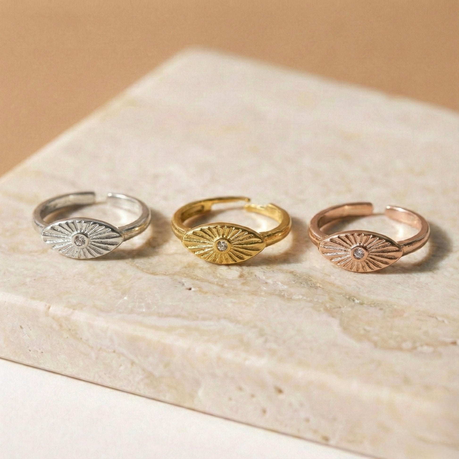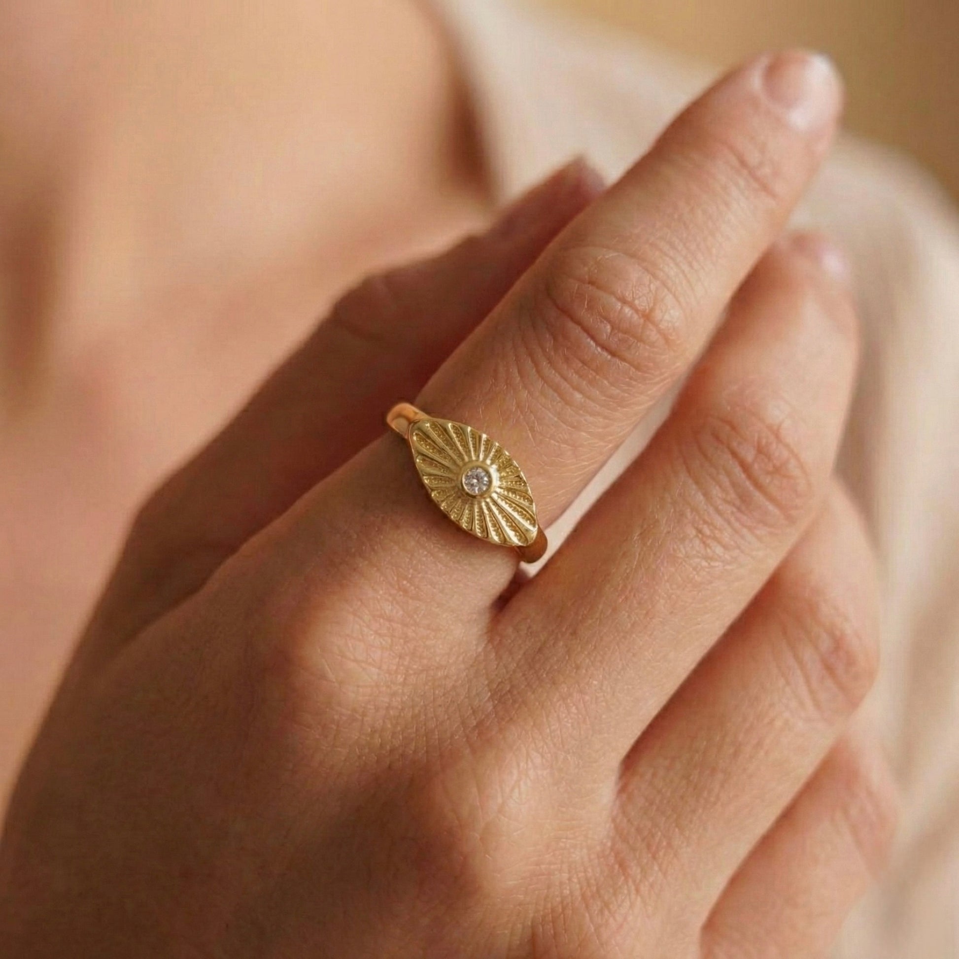 Şafağın ilk ışıklarından ve her şeyi aydınlatan bir parıltıdan ilham alan bu tasarım, markiz (badem) formu üzerindeki ışınsal detaylarla stilinize mistik bir derinlik katar. Merkezindeki ışıltılı taş, tasarıma "Sessiz Lüks" anlayışına uygun rafine bir parıltı kazandırırken, vintage dokusuyla zamansız bir imza niteliği taşır. Her bir Minon parçası usta zanaatkarların elinde şekillenir; bu nedenle el işçiliğinin doğasından kaynaklanan minik detay farklılıkları her tasarımı eşsiz ve size özel kılar.