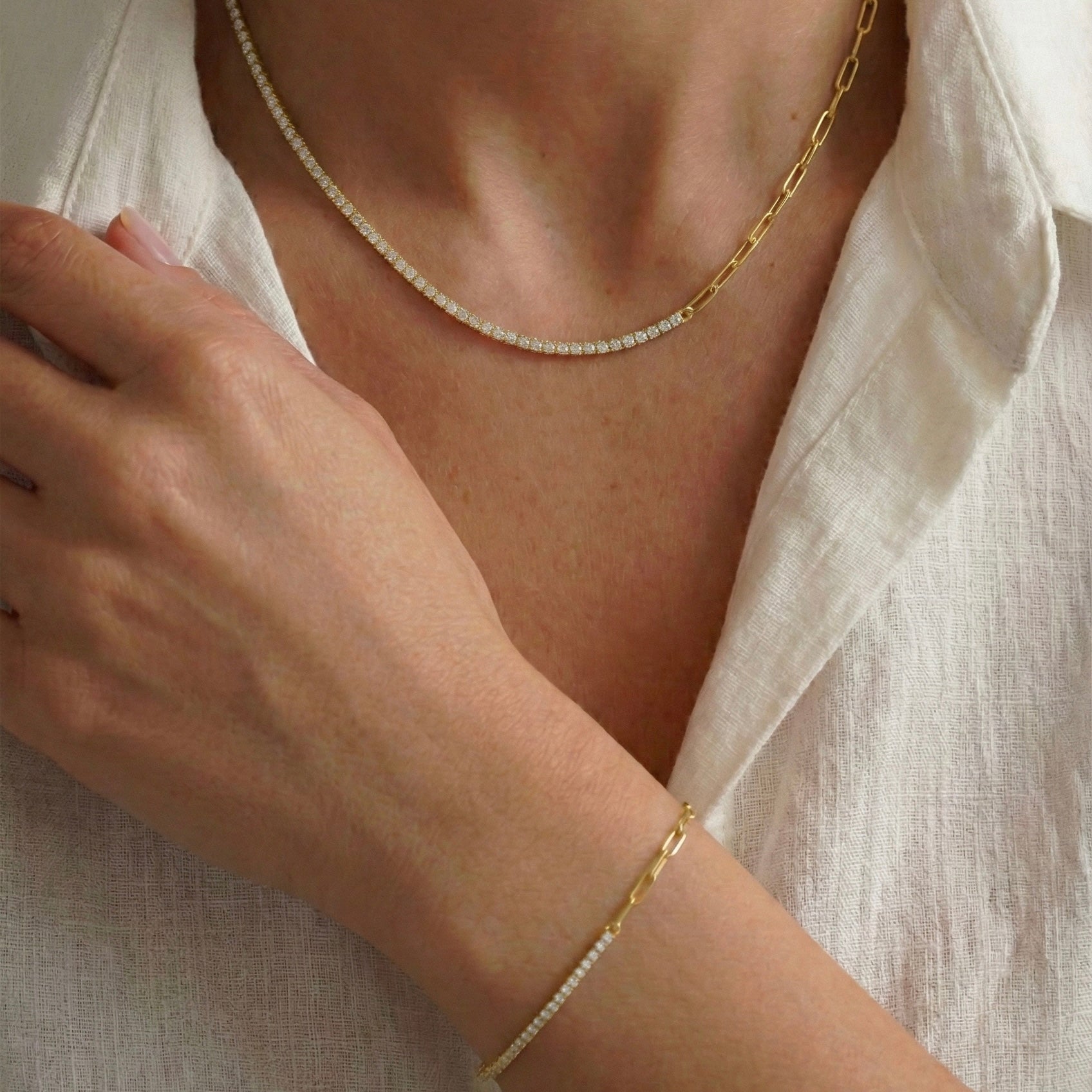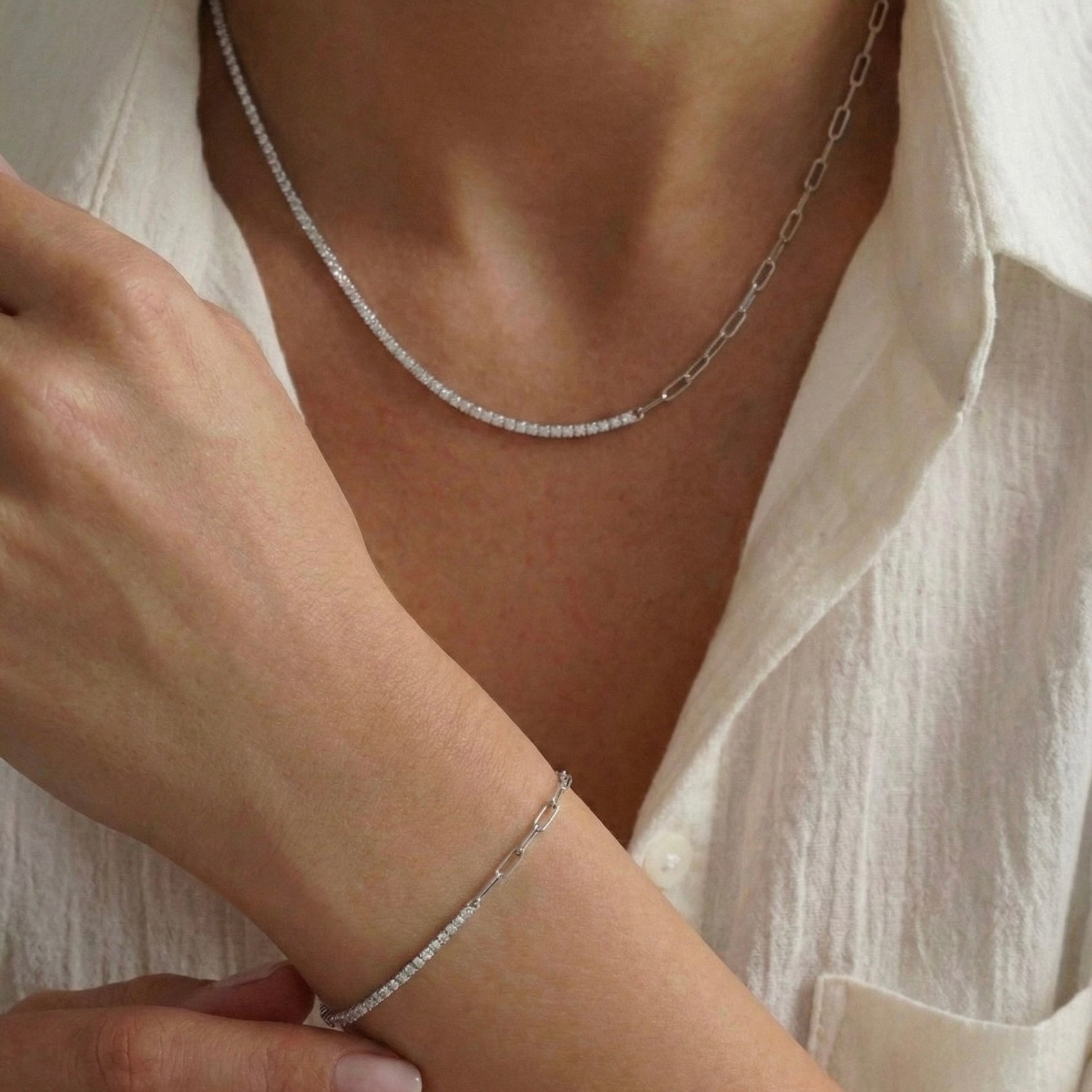 Zıtlıkların kusursuz dengesini keşfedin. Dual Link Tennis Set, zamansız zarafeti temsil eden ışıltılı su yolu (tennis) dokusunu, modern ve dinamik hatlara sahip ataç (paperclip) zincirle birleştirerek stilinize sofistike bir imza katar. Bu özel set, hem narin bir ışıltı hem de güçlü bir karakter arayanlar için birbiriyle tam uyumlu bir kolye ve bileklikten oluşur. Her bir parça usta zanaatkarların elinde şekillenir; bu nedenle el işçiliğinden kaynaklanan minik detay farklılıkları setinizi sadece size özel kılar.