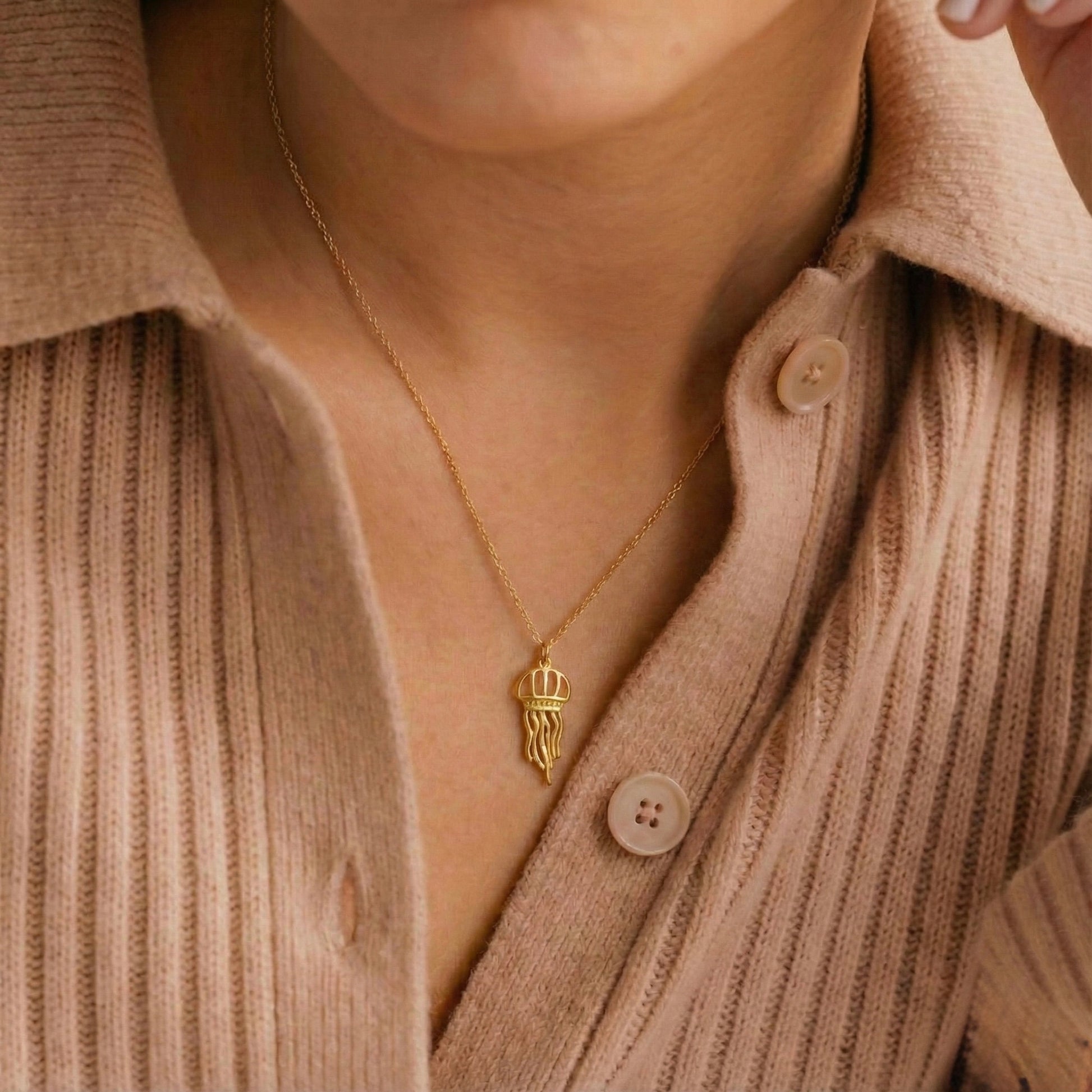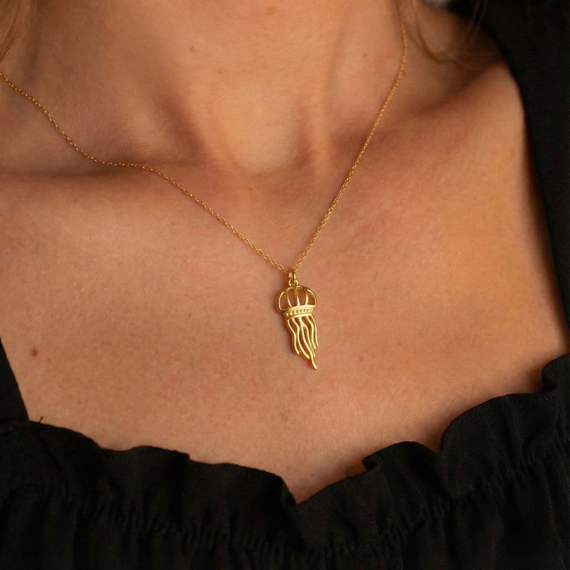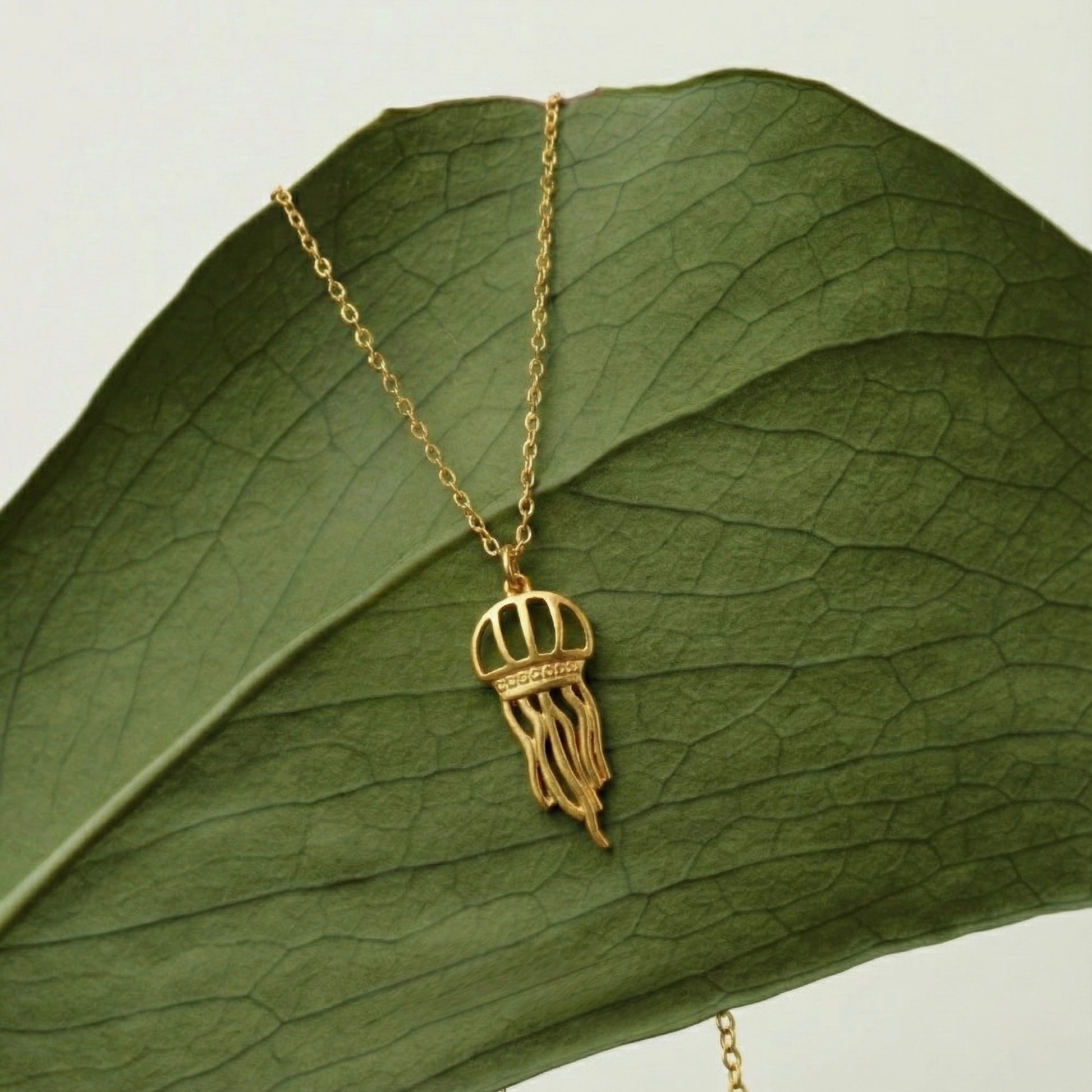 Denizin Gizemli ve Akışkan Zarafeti Okyanusun en narin ve büyüleyici canlılarından biri olan denizanası, modern bir tasarımla hayat buluyor. Altın kaplamanın sıcak ışıltısı ve minimalist formuyla hazırlanan bu kolye, stilinize hem sanatsal hem de sofistike bir dokunuş katar.