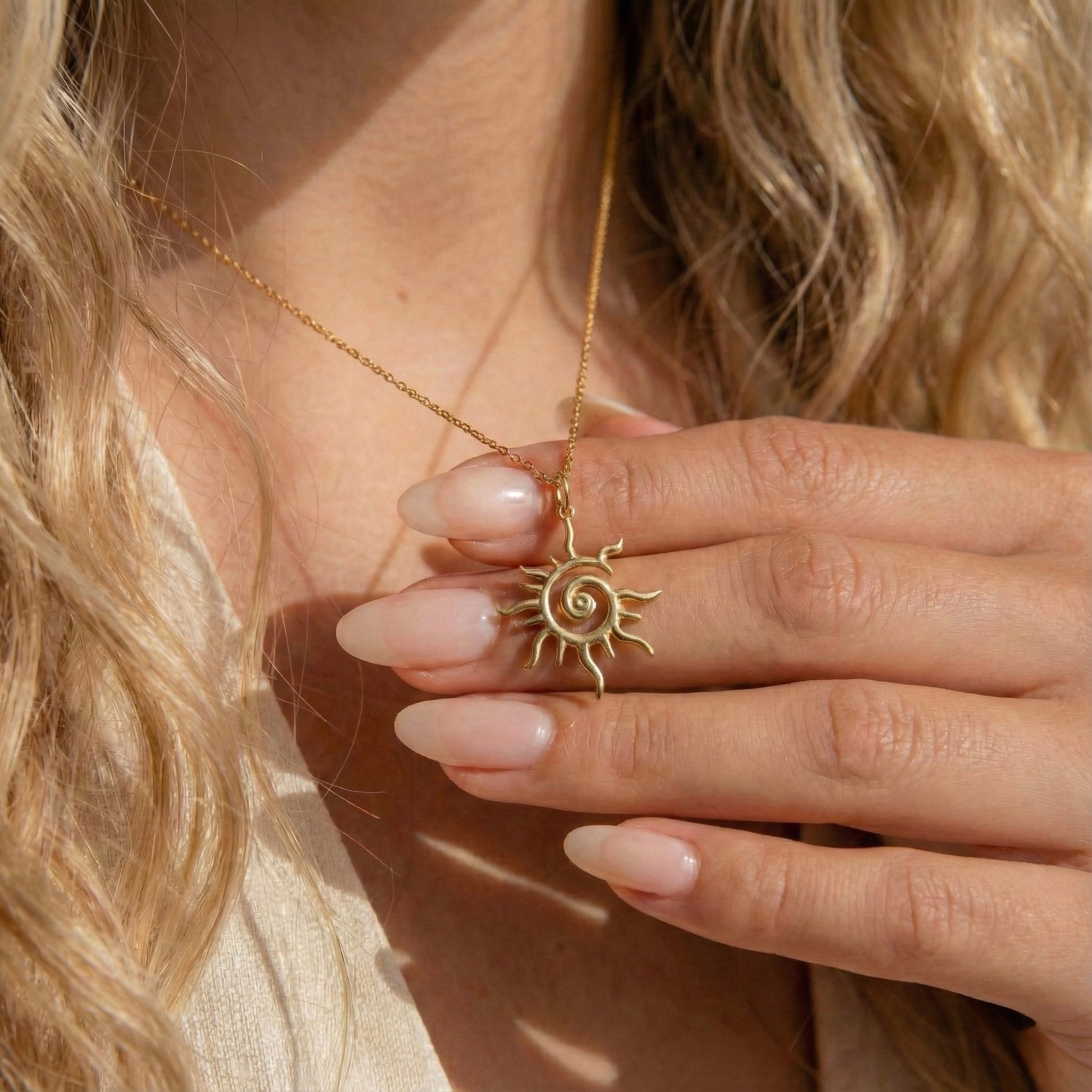 Sonsuz Enerjinin ve Işıltının Sembolü Güneşin yaşam veren gücünü sarmal bir formla yeniden yorumlayan bu ikonik tasarım, stilinize modern bir derinlik katar. 14K altın kaplamanın sıcak ışıltısı ve minimalist hatlarıyla tasarlanan bu kolye, enerjinizi her an yansıtacak zarif bir imza parçasıdır.