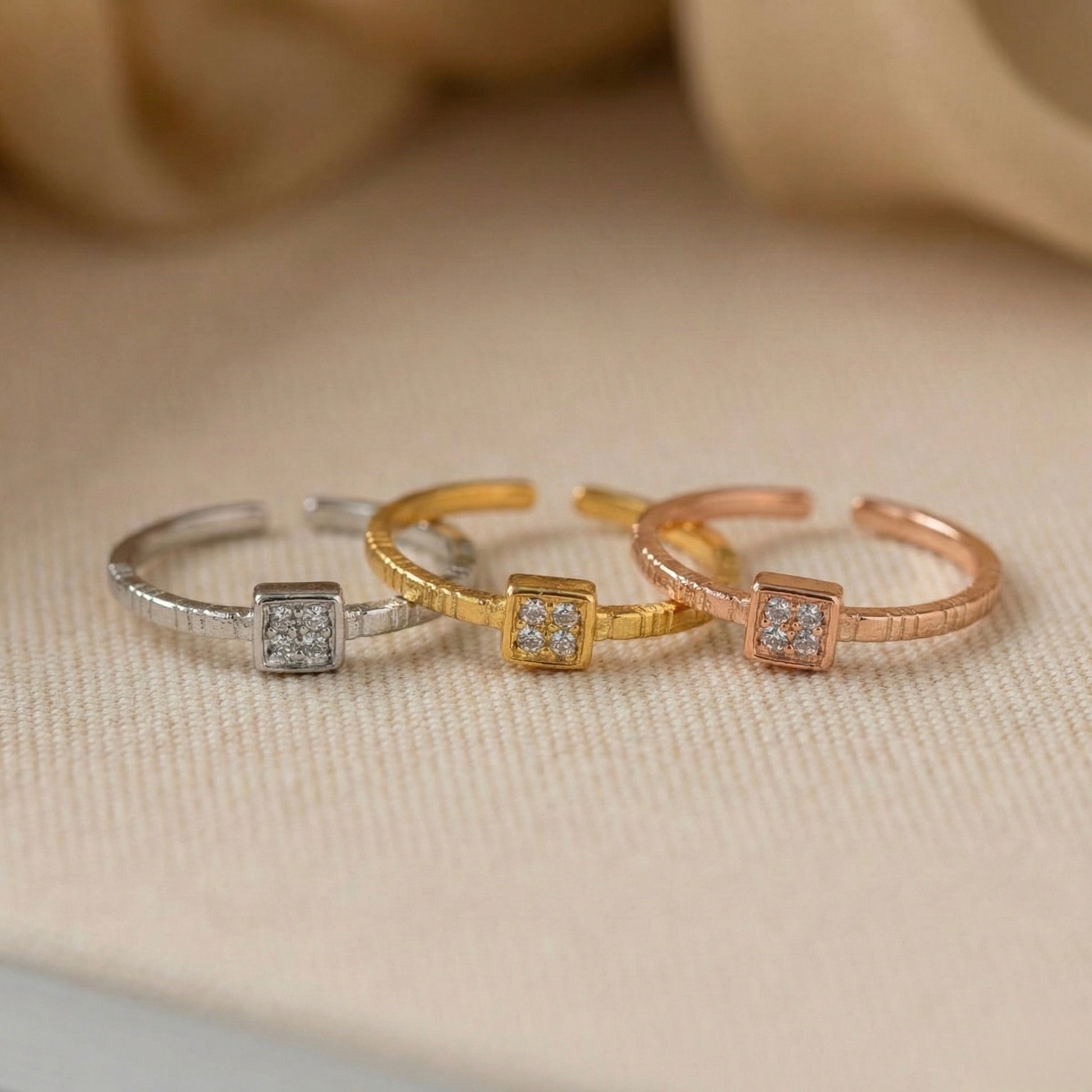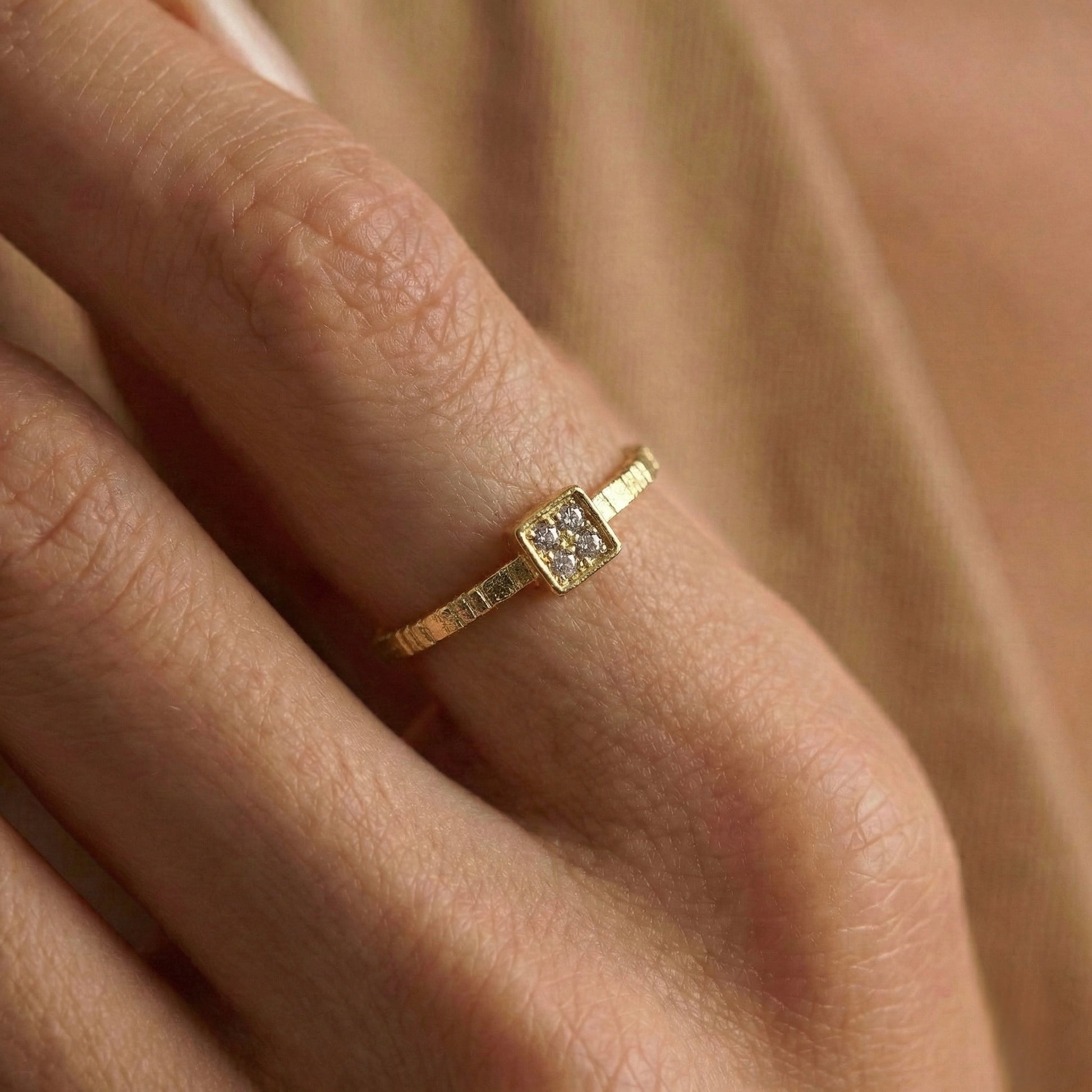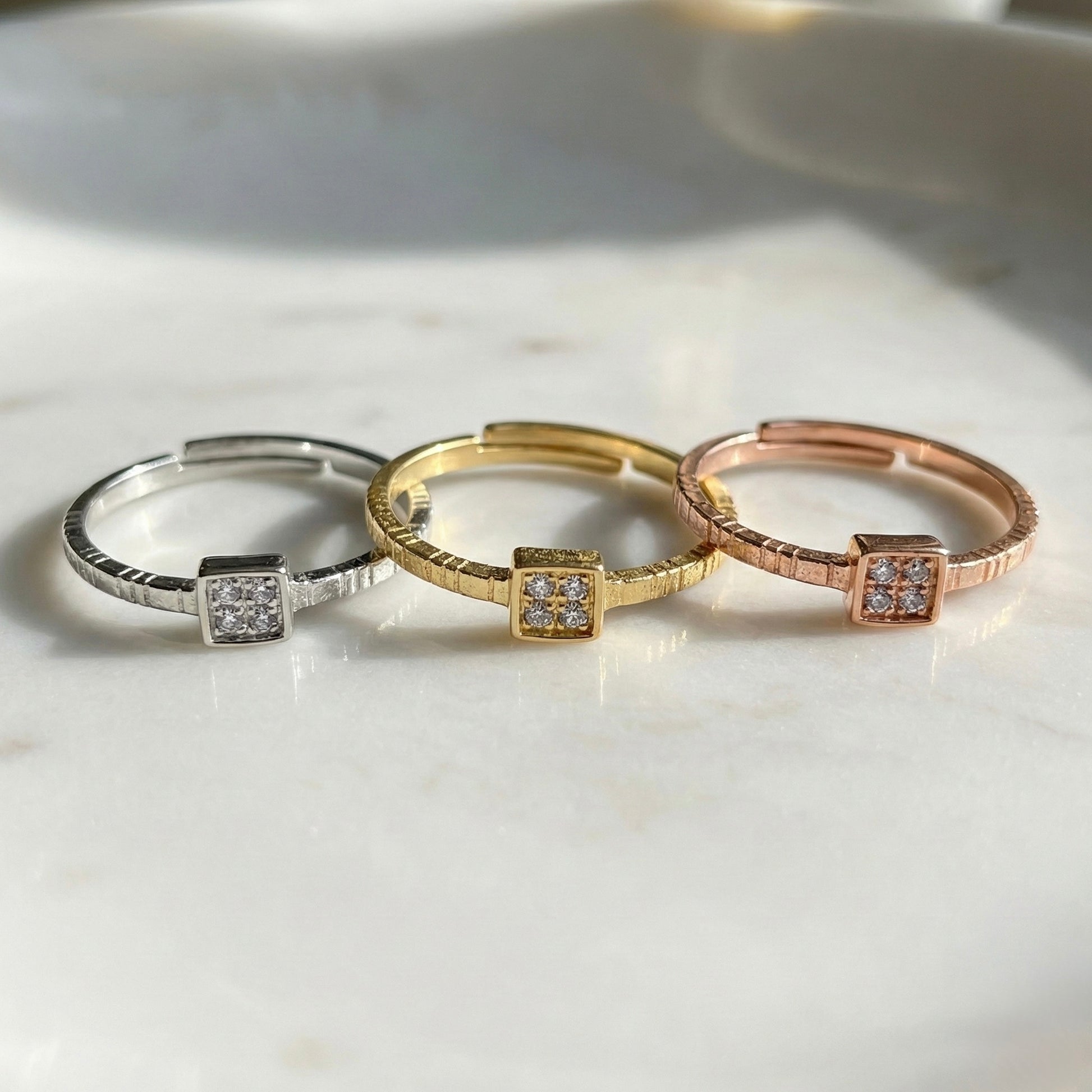 Modern mimarinin keskin hatlarını ve dokusal derinliğini parmağınıza taşıyan bu tasarım, sade bir kare formun içindeki dört adet ışıltılı mikro taşla zarafeti yeniden tanımlıyor. Yüzüğün bandında yer alan özel dikey çizgi dokusu, ışığı her açıda farklı kırarak tasarıma karakter katar. Hem tek başına minimal bir imza olarak kullanılabilir hem de dokulu yapısı sayesinde diğer yüzüklerle kombinlemek için benzersiz bir alternatif sunar. Her bir Minon parçası usta zanaatkarların elinde şekillenir; bu nedenle el işçiliğinin doğasından kaynaklanan minik detay farklılıkları her tasarımı eşsiz ve size özel kılar.