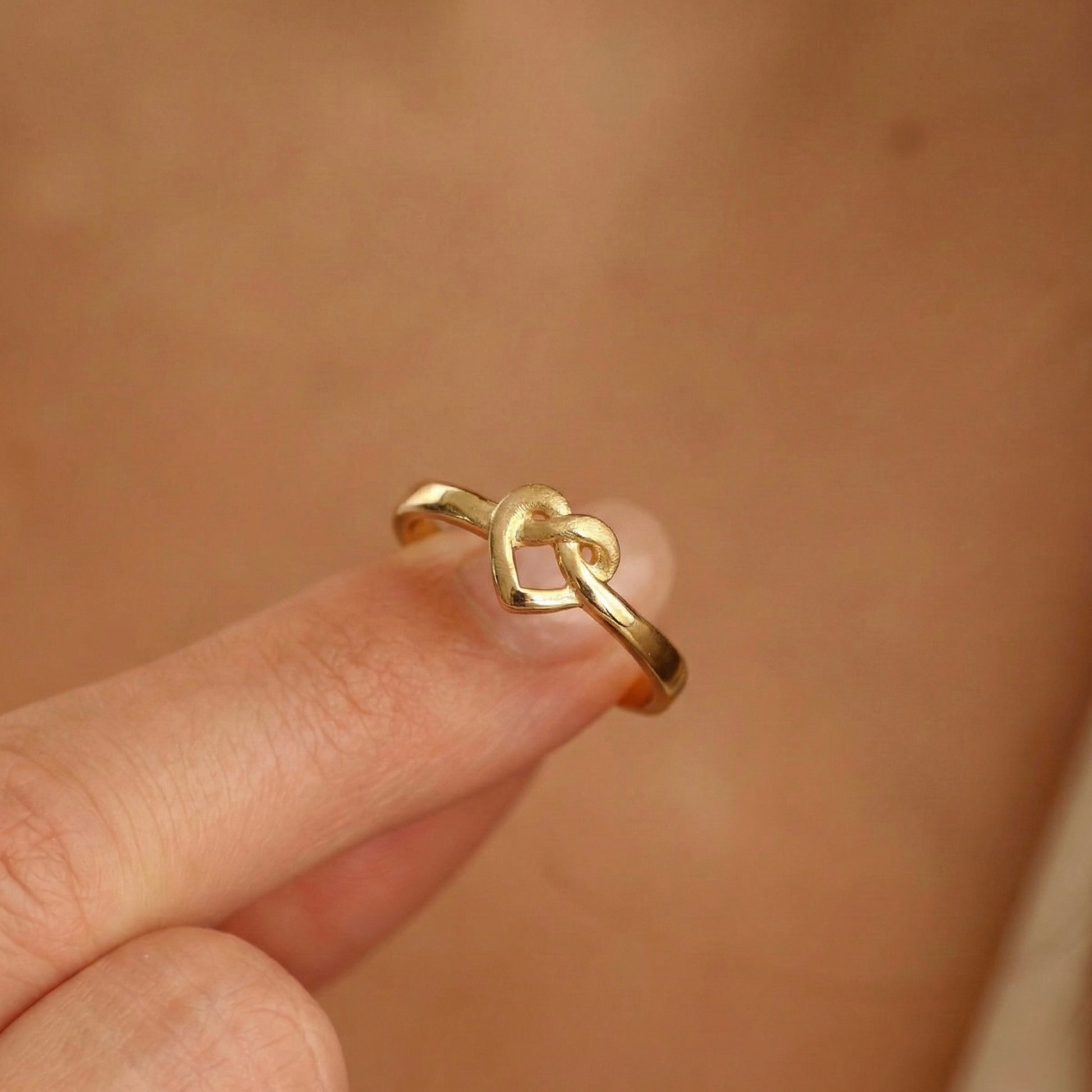 Kalp formunun zarif bir düğüm estetiğiyle birleştiği bu tasarım, sevginin en saf ve kopmaz halini simgeler. Minimalist bandı sayesinde parmağınızda narin bir ışıltı yaratırken, günlük stilinize anlamlı ve zamansız bir dokunuş katar. Her bir Minon parçası usta zanaatkarların elinde şekillenir; bu nedenle el işçiliğinin doğasından kaynaklanan çok küçük detay farklılıkları her tasarımı eşsiz ve size özel kılar.