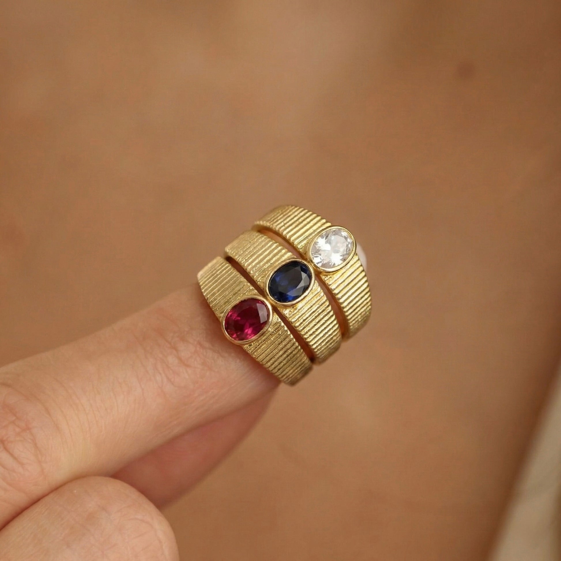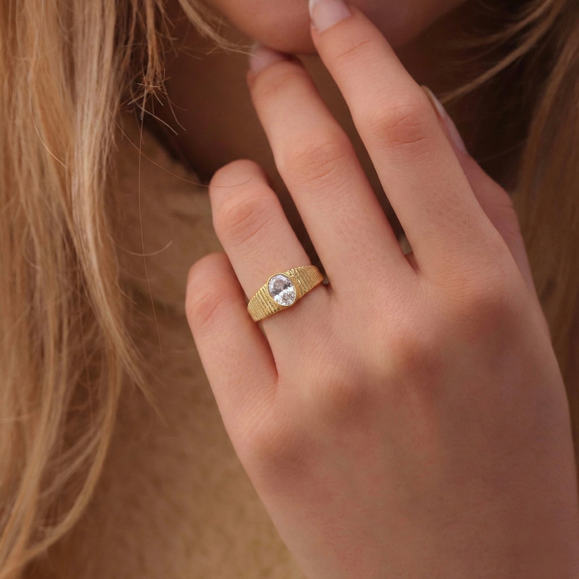 Klasik zarafeti modern ve dokulu bir tasarımla buluşturan bu mühür yüzüğü, her stile rafine bir ışık katar. Dikey oluklu (ribbed) gövde yapısı, merkezindeki oval kesim berrak kristal taşın saflığını ön plana çıkarırken parmağınızda güçlü bir duruş sergiler. Her bir Minon parçası usta zanaatkarların elinde şekillenir; bu nedenle el işçiliğinden kaynaklanan minik detay farklılıkları her tasarımı eşsiz kılar.