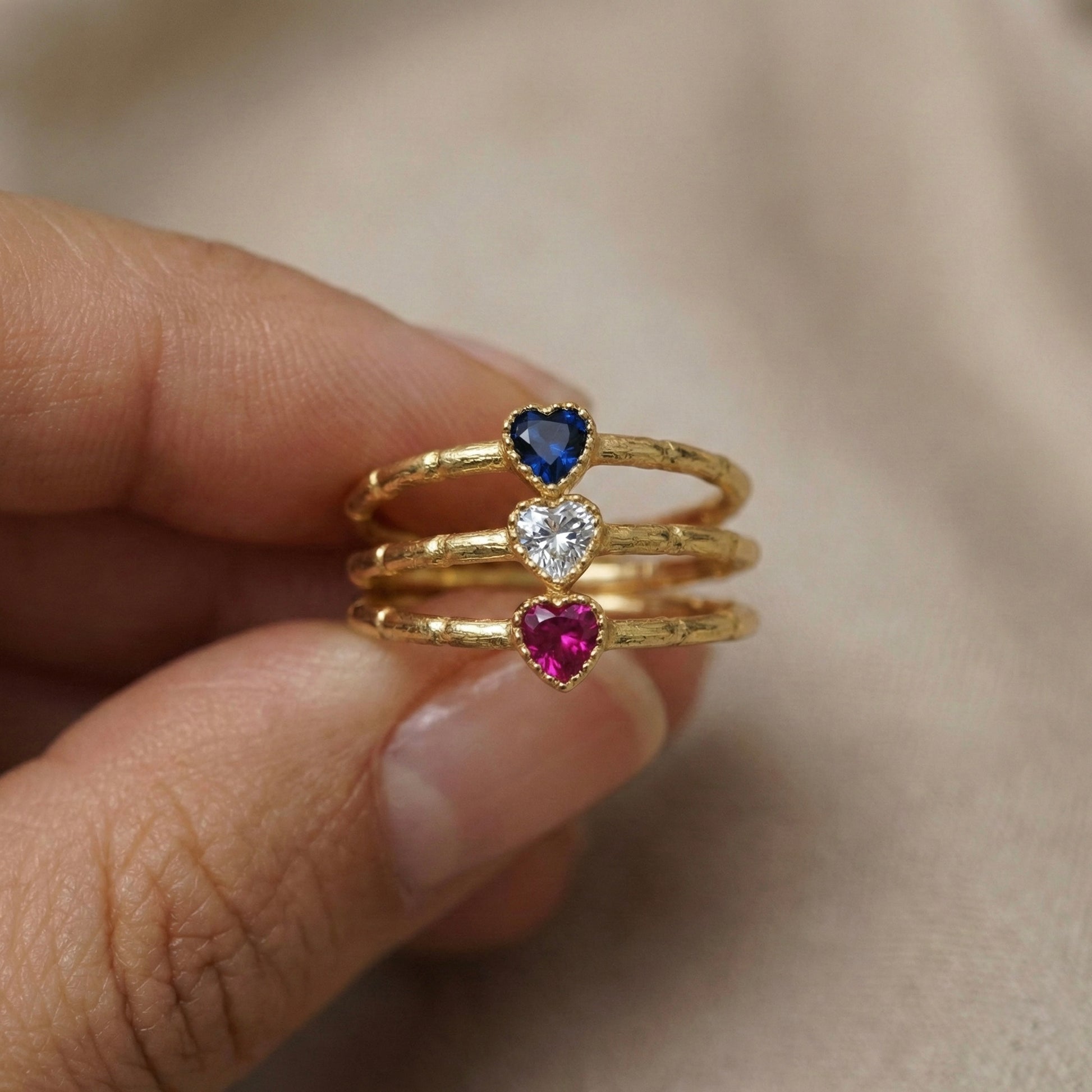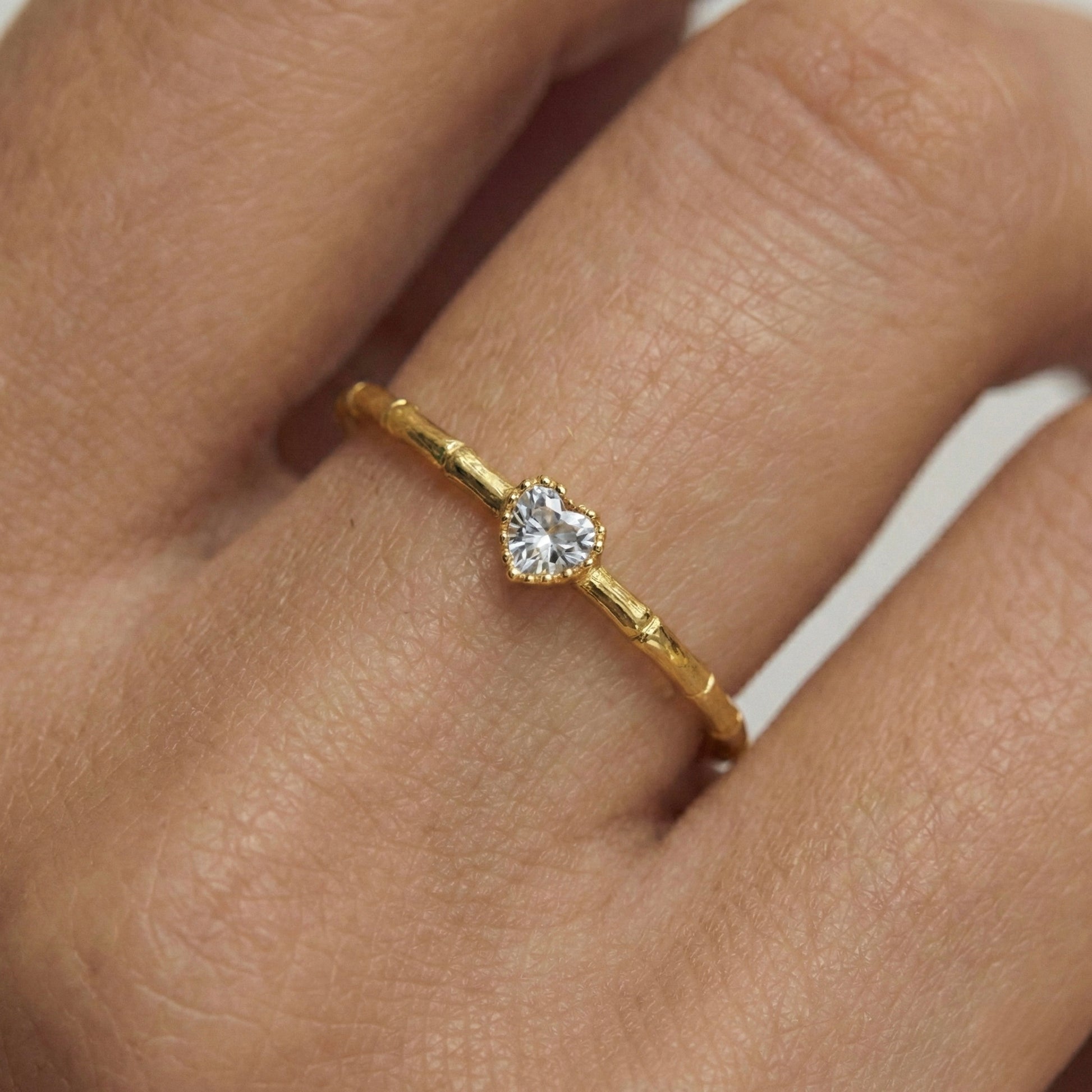 Küçük detayların büyük anlamlar taşıdığına inananlar için tasarlanan bu yüzük, sevginin en zarif sembolünü modern bir dokuyla buluşturuyor. Kalp kesim mikro kristal taşın ışıltısı, el işçiliğiyle kazandırılan organik bant dokusuyla birleşerek parmağınızda masum bir parıltı yaratır. Tek başına narin bir imza olarak kullanabilir veya diğer "Minon" yüzüklerinizle üst üste (stackable) kullanarak kendi stil hikayenizi yaratabilirsiniz.
