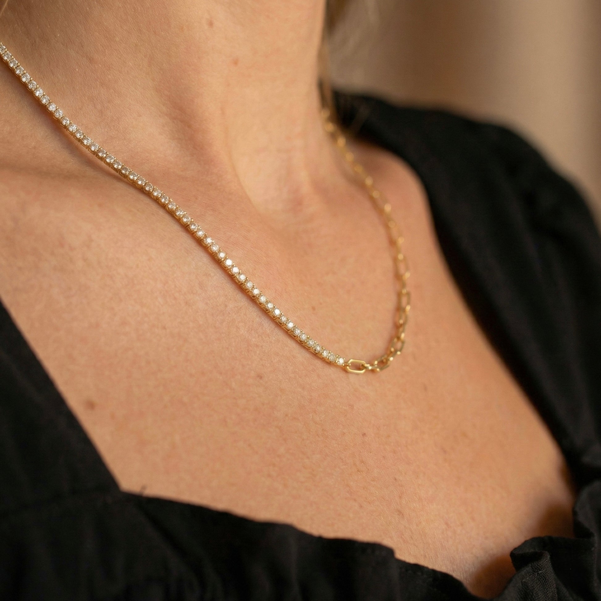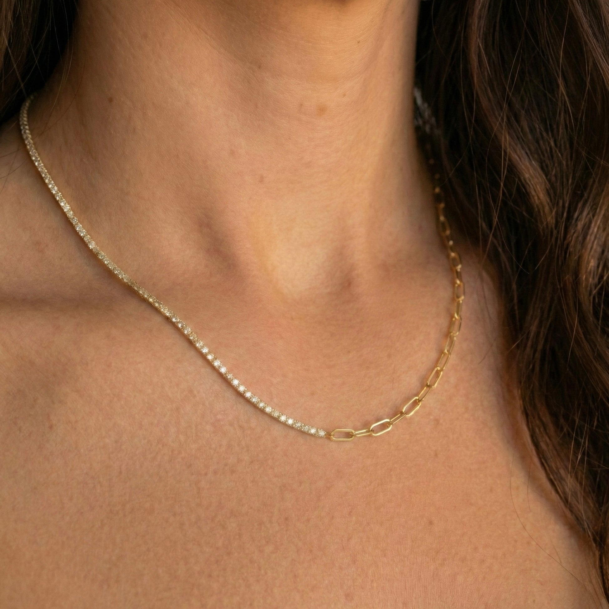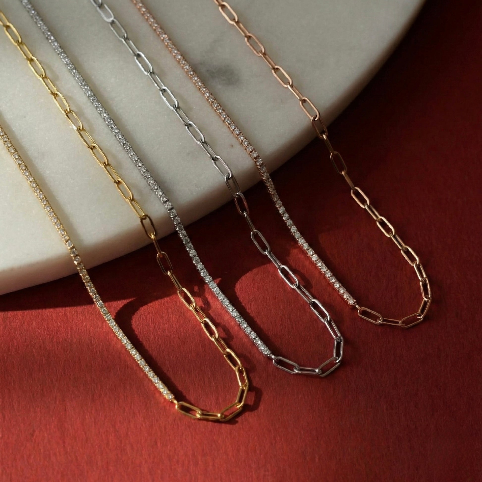 Klasik zarafeti modern bir tavırla yeniden yorumlayan bu tasarım, stilinde dengeyi ve özgünlüğü arayanlar için hazırlandı. Kolyenin bir yarısı zamansız su yolu (tennis chain) ışıltısını taşırken, diğer yarısı modern ataç (paperclip) zincir formunun güçlü ve yalın duruşunu sergiler. İster ışıltılı tarafı odak noktası yapın, ister zincir detayını öne çıkarın; bu hibrit parça her iki dünyanın en iyi yanlarını tek bir formda birleştirir. Her bir Minon parçası usta zanaatkarların elinde şekillenir; bu nedenle el işçiliğinin doğasından kaynaklanan minik detay farklılıkları her tasarımı eşsiz ve size özel kılar.