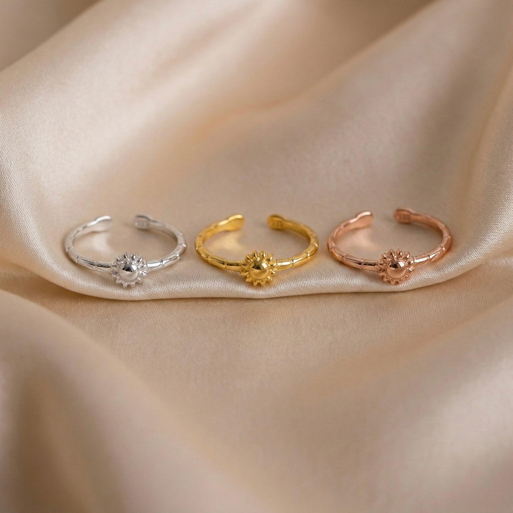 Hayatın kaynağı olan güneşin enerjisini en zarif ve minimalist haliyle parmağınıza taşıyan bu tasarım, narin duruşuyla her anınıza eşlik eder. İnce bant yapısı ve merkezindeki mini güneş figürü, sadeliği şık bir imza parçaya dönüştürür. Her bir Minon parçası usta zanaatkarların elinde şekillenir; bu nedenle el işçiliğinin doğasından kaynaklanan çok küçük detay farklılıkları her tasarımı eşsiz ve size özel kılar.